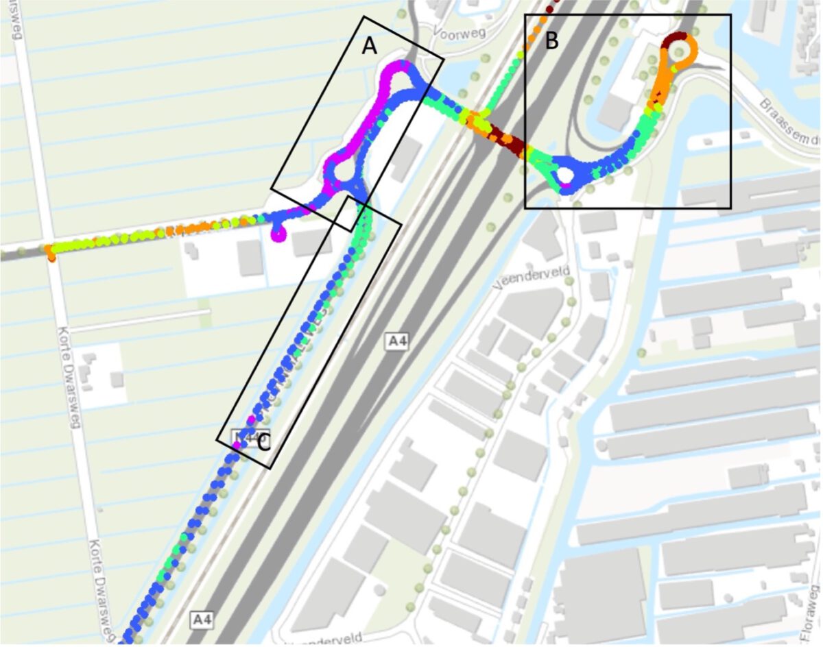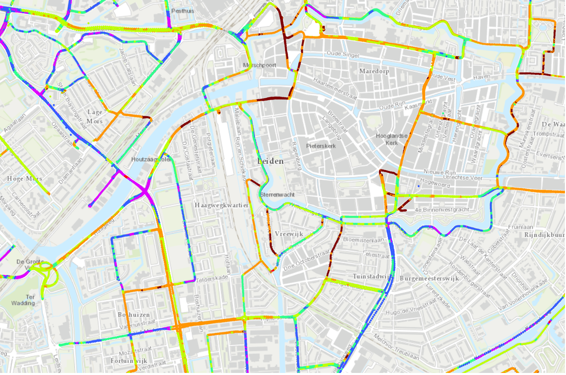 De belangrijkste ontsluitingswegen rondom het centrum van Leiden (Figuur 4) zijn ingemeten met de gammaspectrometer. De wegen op de kaart laten veel verschillende kleuren zien. Sommige wegen zijn homogeen van kleur (deze zijn bijvoorbeeld volledig blauw of groen). Andere wegen zijn heterogeen en zijn samengesteld uit veel verschillende kleuren.